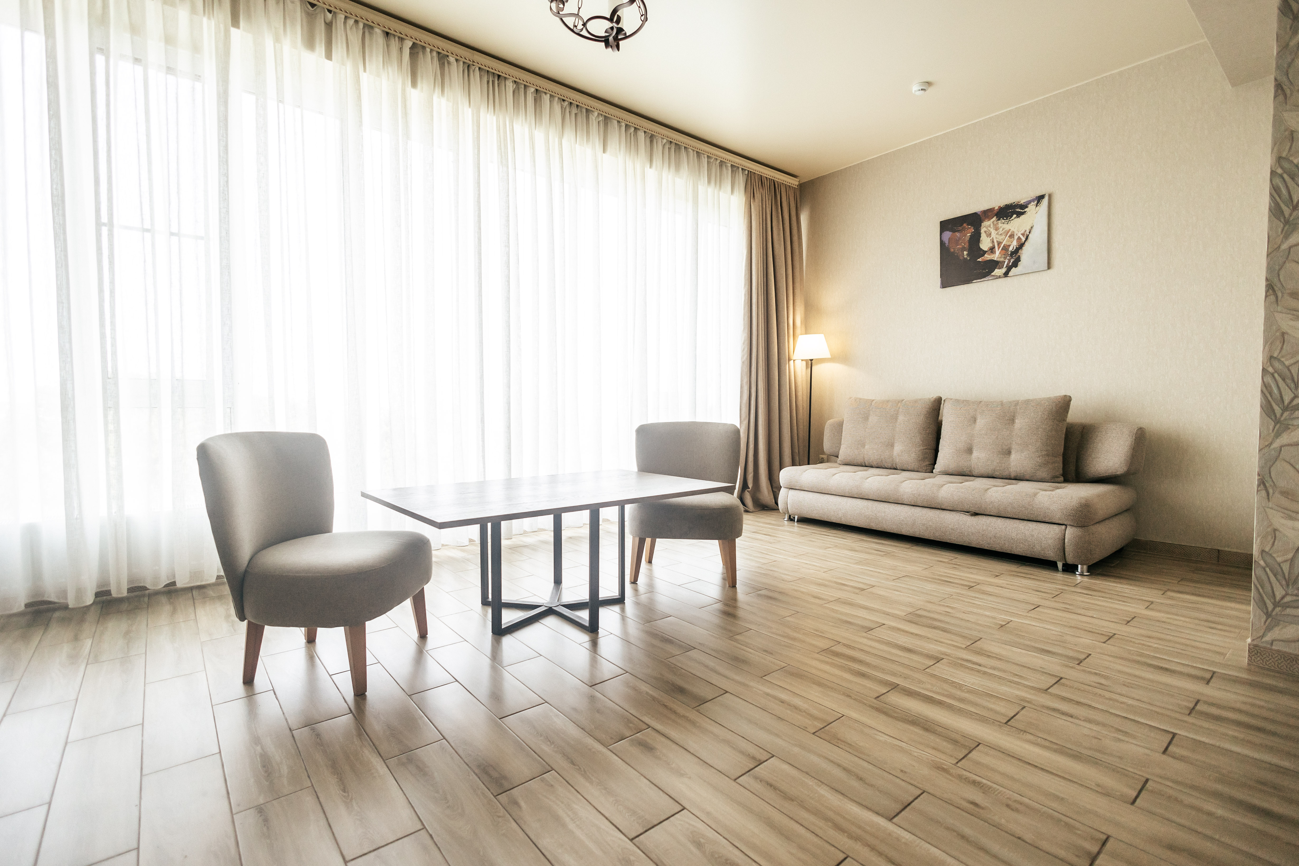 Номер категории Джуниор Сюит Премиум с большой двухспальной кроватью и раскладным диваном. Площадь 60 кв.м. Номер разделен на 2 зоны, зона спальни и зона гостиной. При необходимости возможна установка детской кроватки. Номер оснащен большим телевизором Smart TV, Wi-Fi, холодильником и феном. Большой санузел с ванной и душевой кабиной. Набор косметических принадлежностей, халат и тапочки, зубной и бритвенный набор - по запросу. Завтрак входит в стоимость номера, а также посещение тренажерного зала.