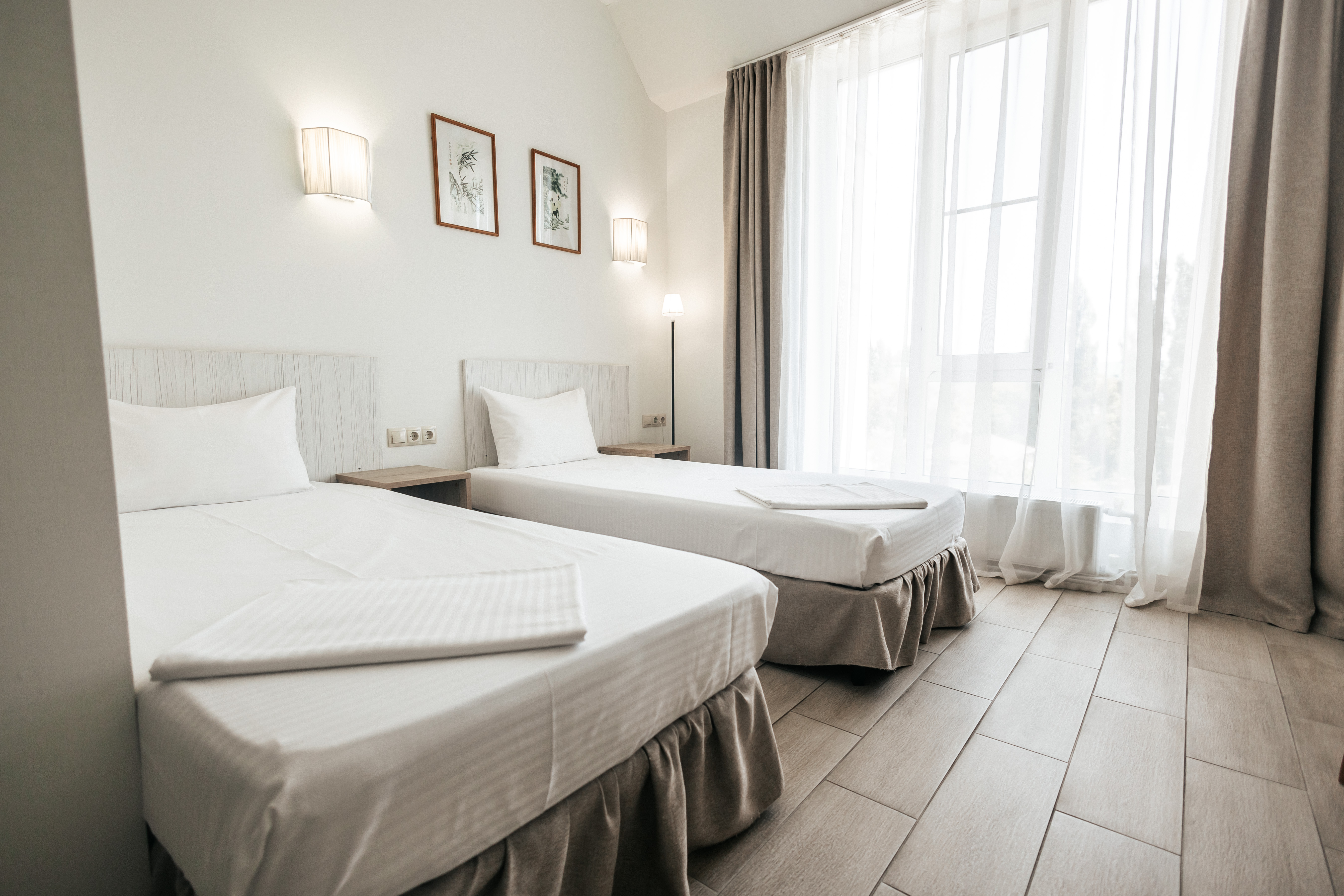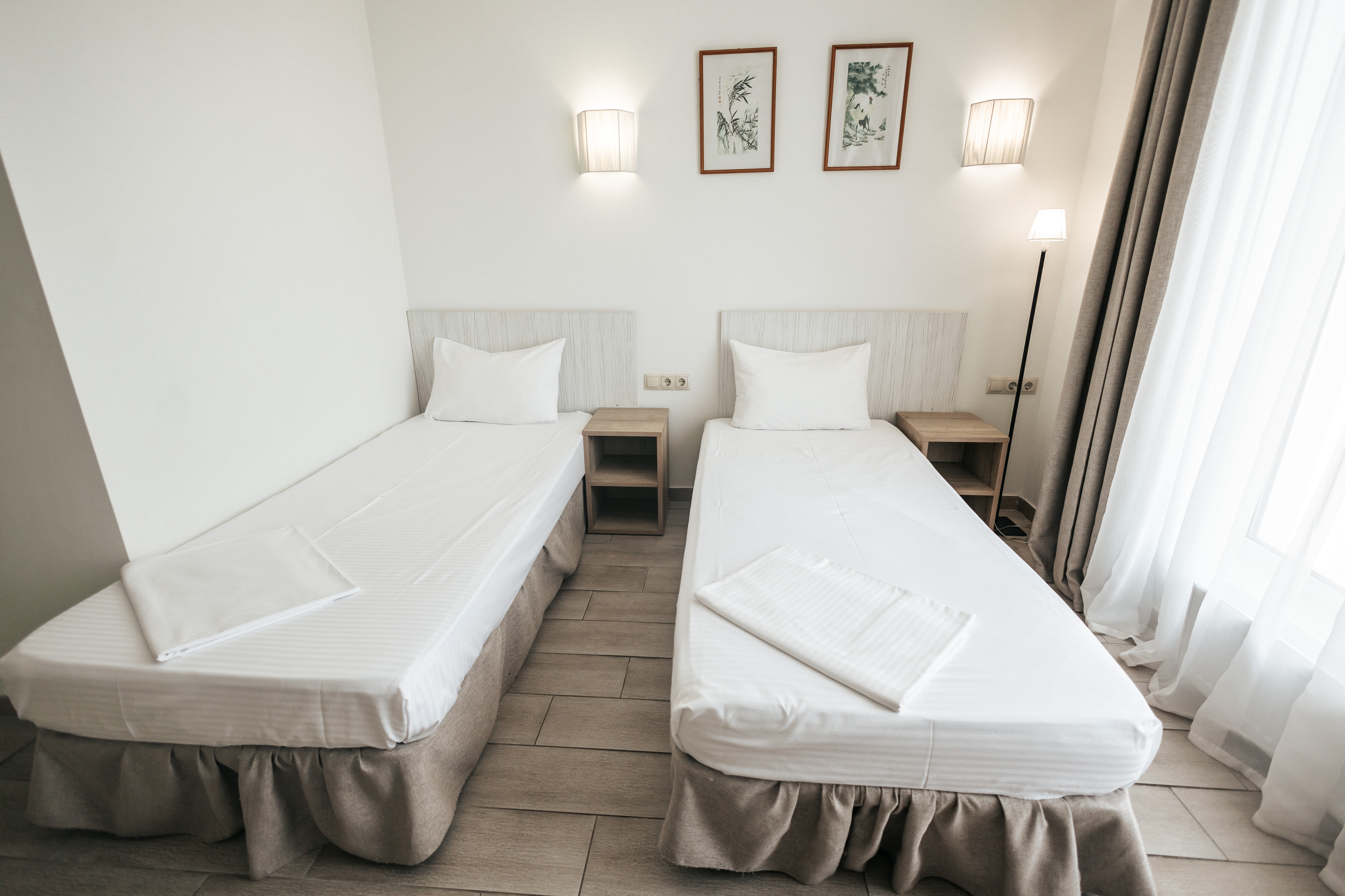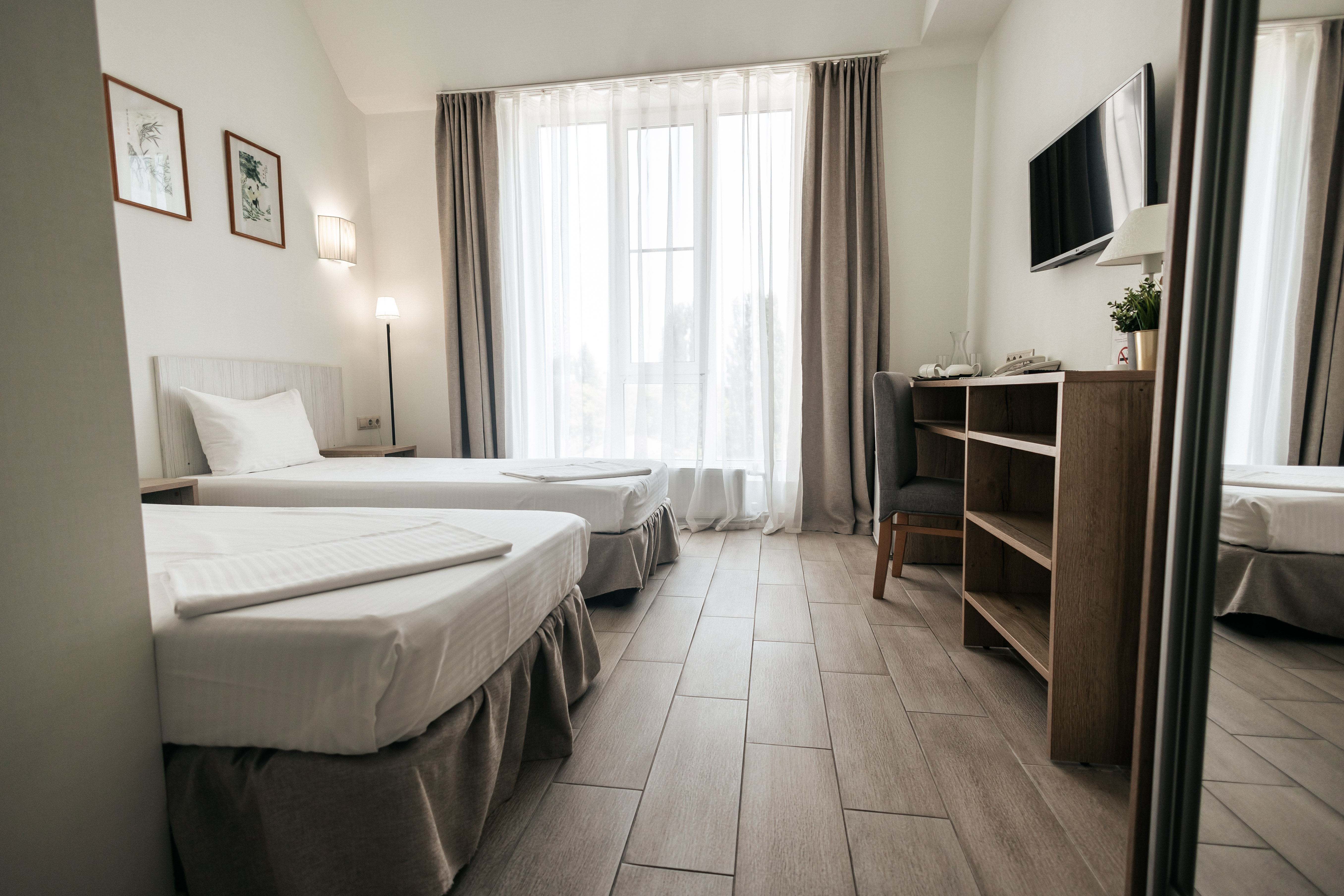 Два спальных места. Две раздельные кровати размером 90х200. Площадь номера 18-20 кв м. Большие панорамные окна, портьеры блекаут. Большой телевизор Smart TV, холодильник, кондиционер, Wi-Fi, рабочий стол, кофейный столик. Чайные наборы и косметические принадлежности. Санузел оснащен душевой кабиной. Завтрак входит в стоимость номера, а также посещение тренажерного зала.