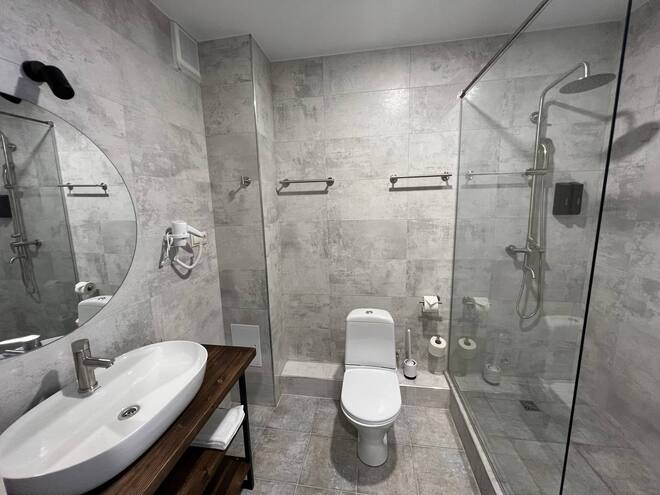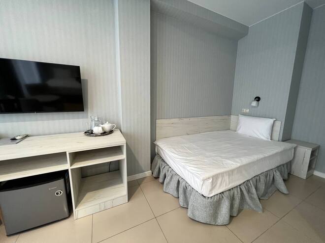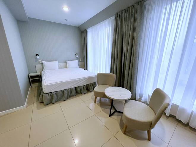 Семейный номер. Варианты размещения: Одна большая кровать (180х200) и полуторная кровать (110х200) Либо две раздельные кровати 90х200 и полуторная кровать (110х200) Предполагает размещение троих взрослых, либо семьи. Большой телевизор Smart TV, кондиционер, холодильник. Рабочий стол и кофейный столик, удобные стулья и кресла. Чайный набор и набор косметических средств для каждого гостя. Большие панорамные окна выходят во двор, портьеры блекаут. Санузел оснащен душевой кабиной. В стоимость включены завтраки, посещение тренажерного зала.