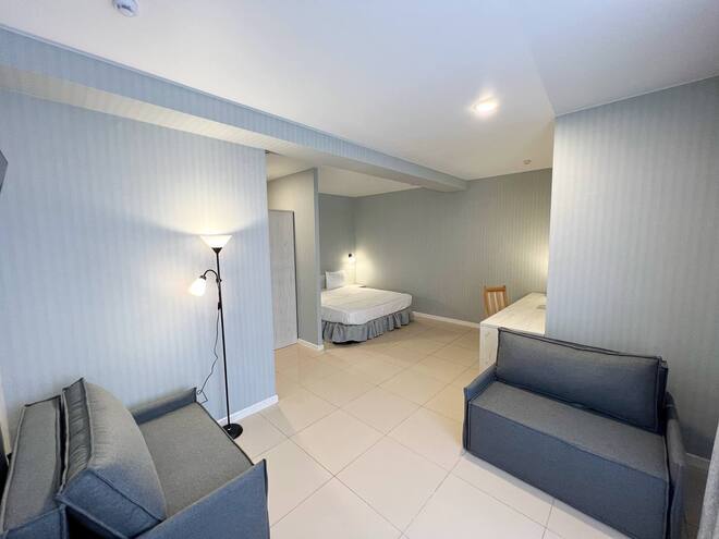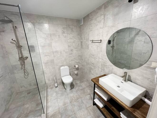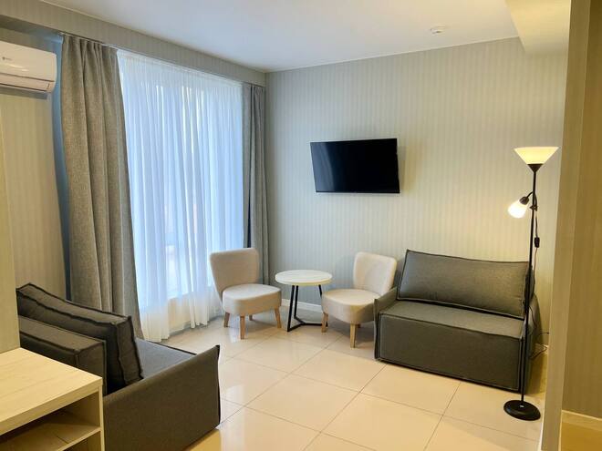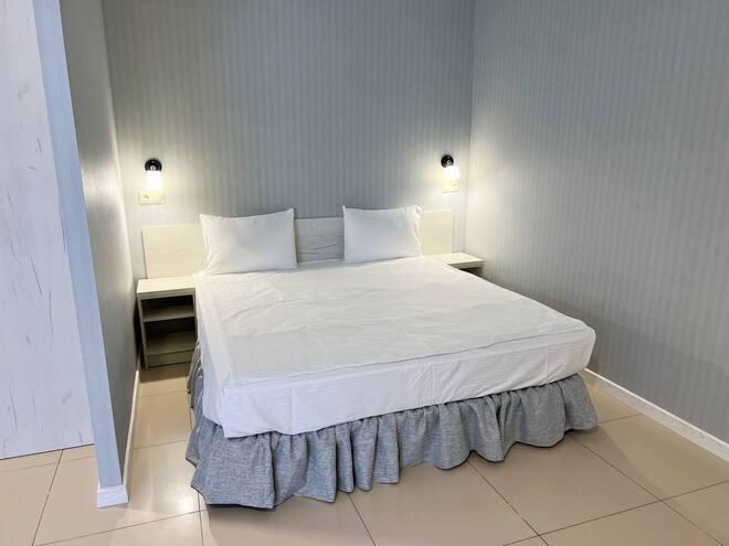 Большой двухместный номер.Площадь - 35 кв м. Одна большая кровать 180х200 и два дивана-кровати. Максимальная вместимость номера 4 человека. Номер оснащен большим телевизором Smart TV, Wi-Fi, холодильником, феном. Набор косметических принадлежностей, халат и тапочки, зубной и бритвенный набор - по запросу. Просторный санузел с душевой кабиной. Завтрак входит в стоимость номера, а также посещение и тренажерного зала.