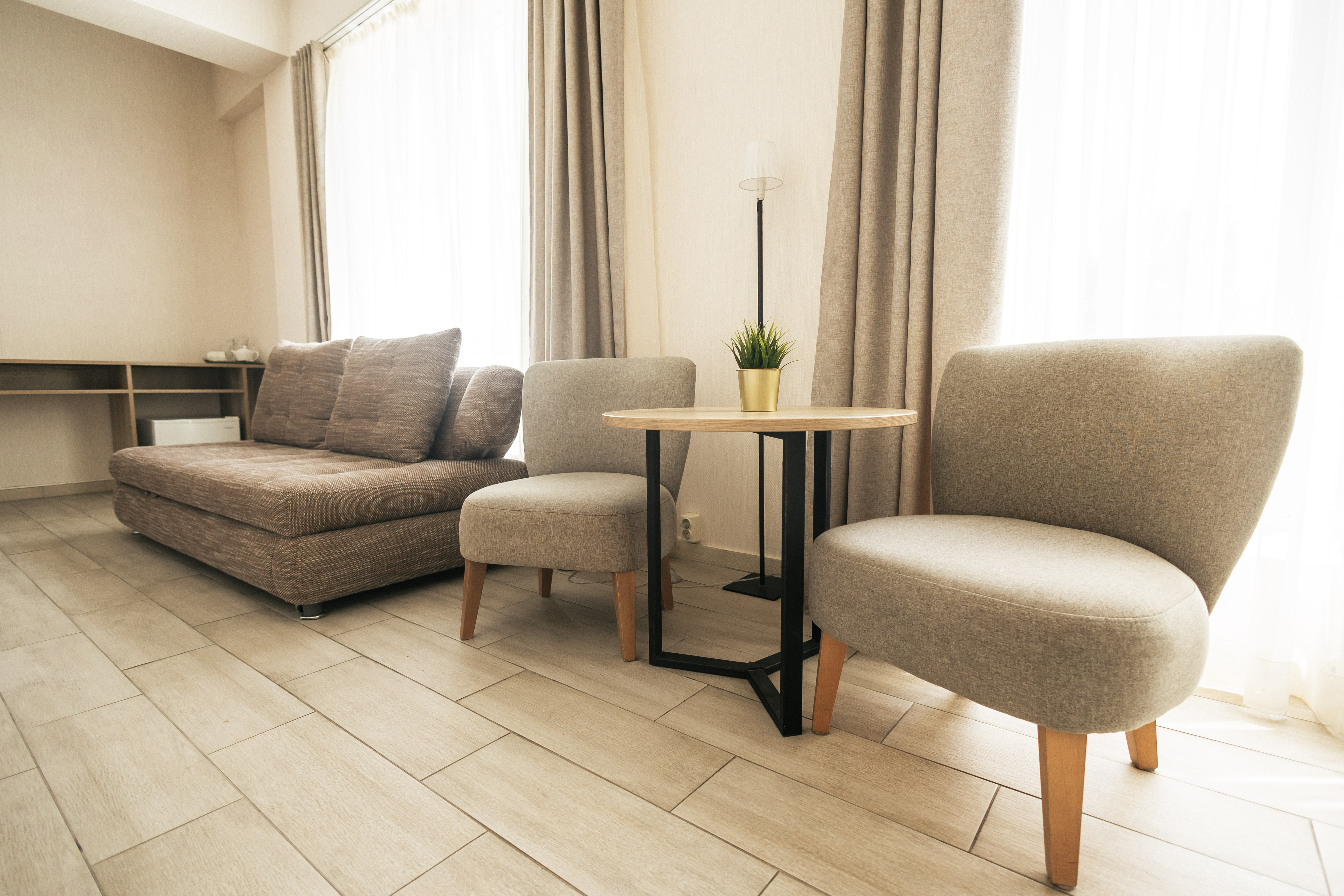 Семейный номер. Варианты размещения: Одна большая кровать (180х200) и двухспальный диван Либо две раздельные кровати 90х200 и двухспальный диван. Предполагает размещение троих взрослых, либо семьи с 1-2 детьми. Большой телевизор Smart TV, кондиционер, холодильник. Рабочий стол и кофейный столик, удобные стулья и кресла. Чайный набор и набор косметических средств для каждого гостя. Большие панорамные окна выходят во двор, портьеры блекаут. Санузел оснащен ванной. В стоимость включены завтраки, посещение тренажерного зала.